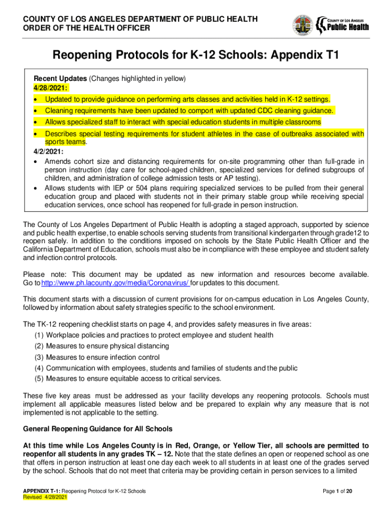 ORDER OF THE HEALTH OFFICERReopening Protocols for K12 Schools: Appendix T1
