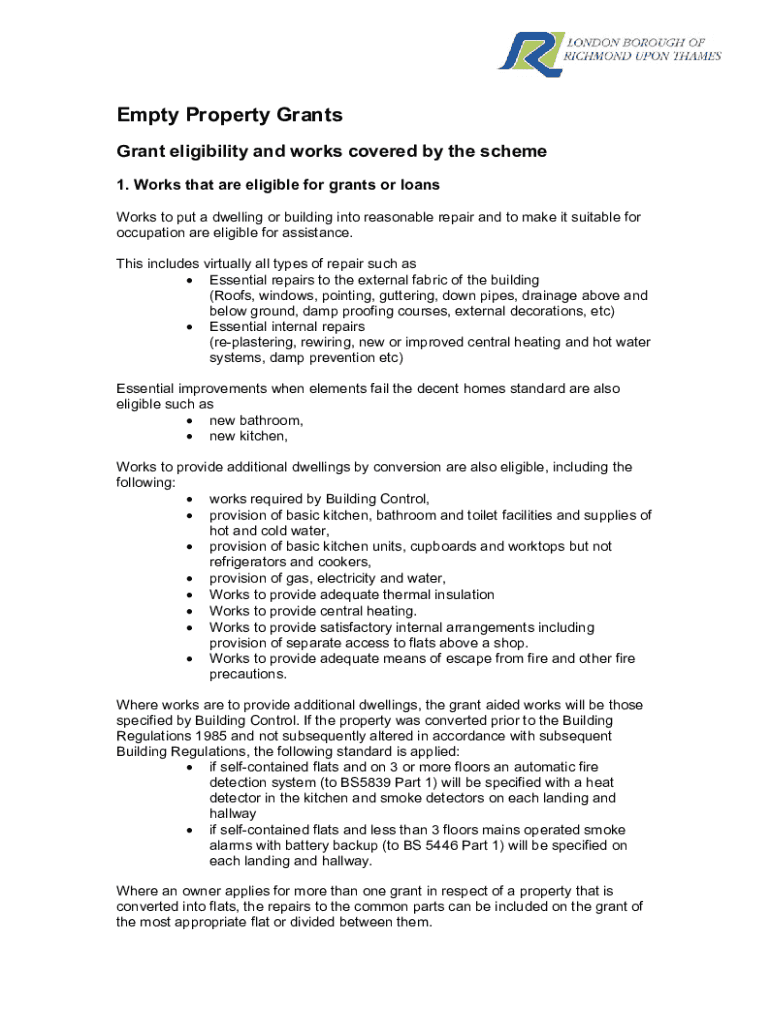 Empty Property Grants Grant eligibility and works covered by the scheme 1. Works that are eligible for grants or loans Works to put a dwelling or building into reasonable repair and to make it suitable
