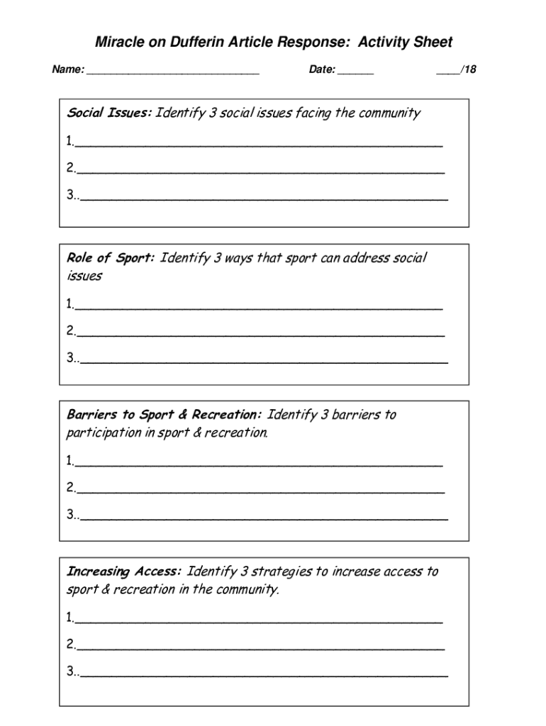 Miracle on Duffer in Article Response: Activity Sheet Name: ___Date: ______/18Social Issues: Identify 3 social issues facing the community 1.___ 2.___ 3.___Role of Sport: Identify 3 ways that sport