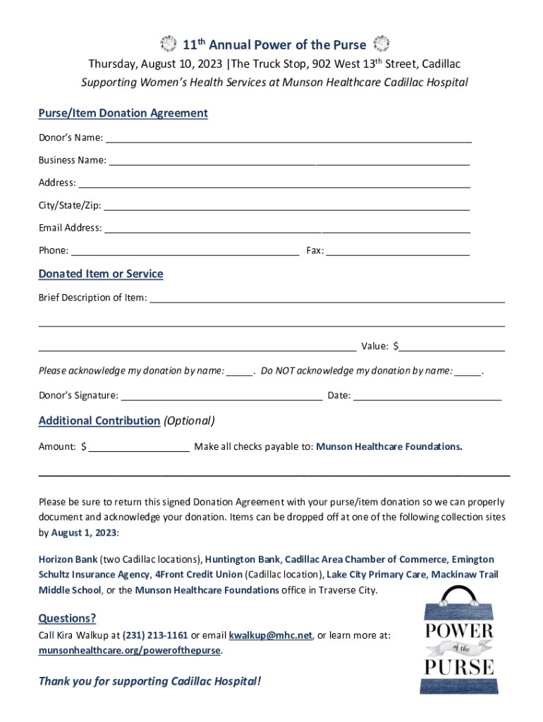 11th Annual Power of the Purse Thursday, August 10, 2023 |The Truck Stop, 902 West 13th Street, Cadillac Supporting Women's Health Services at Manson Healthcare Cadillac HospitalPurse/Item Donation
