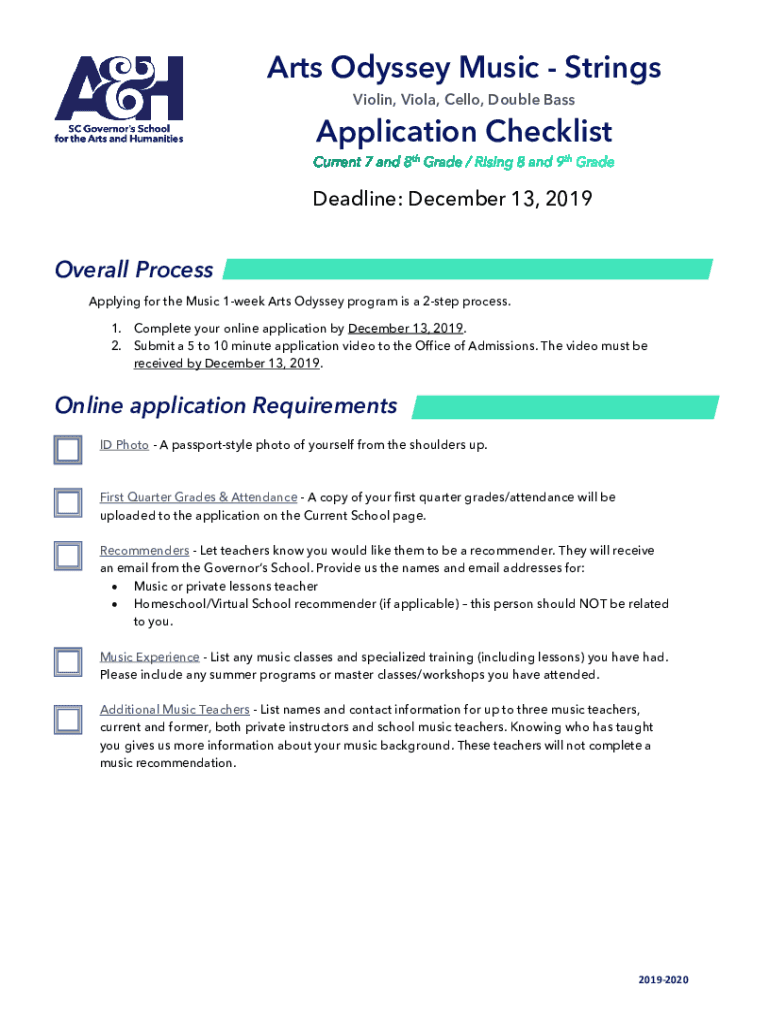Arts Odyssey Music Strings Violin, Viola, Cello, Double Misapplication Checklist Deadline: December 13, 2019Overall Process Applying for the Music 1week Arts Odyssey program is a 2step process. 1.