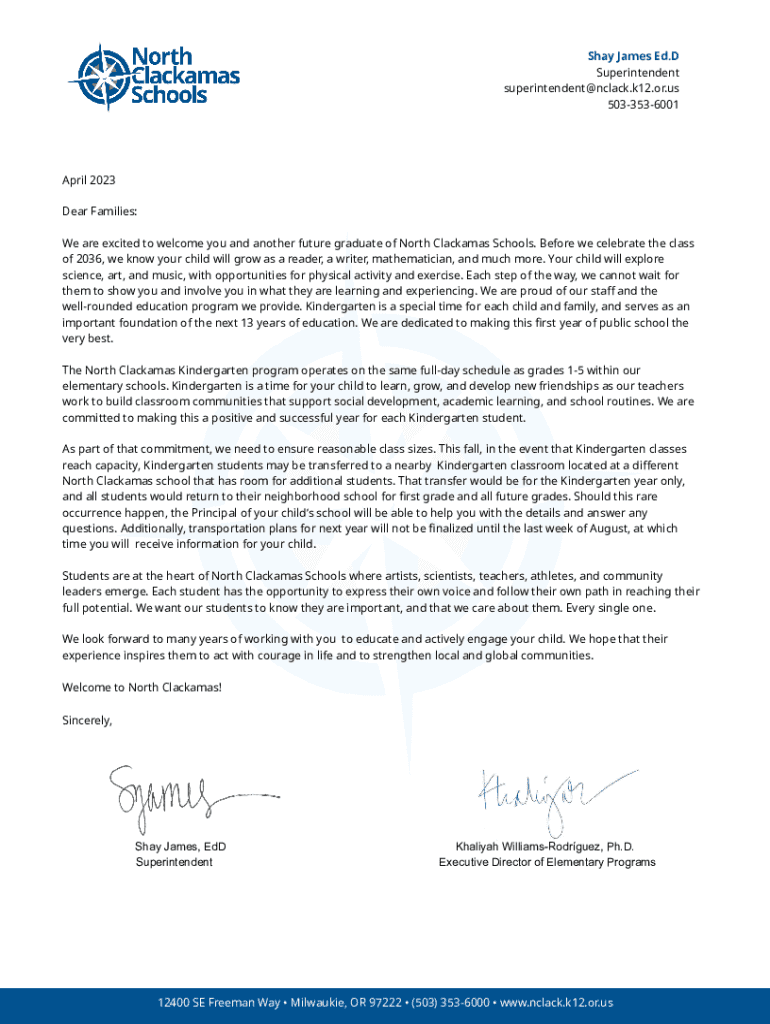 Shay James Ed. D Superintendent superintendent@nclack.k12.or.us 5033536001April 2023 Dear Families: We are excited to welcome you and another future graduate of North Clacks Schools. Before we celebrate