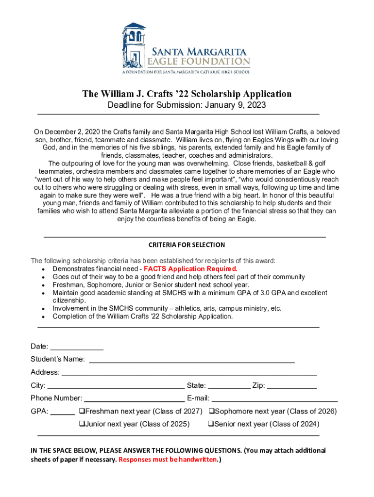 The William J. Crafts 22 Scholarship Application Deadline for Submission: January 9, 2023, On December 2, 2020, the Crafts family and Santa Margarita High School lost William Crafts, a beloved son,