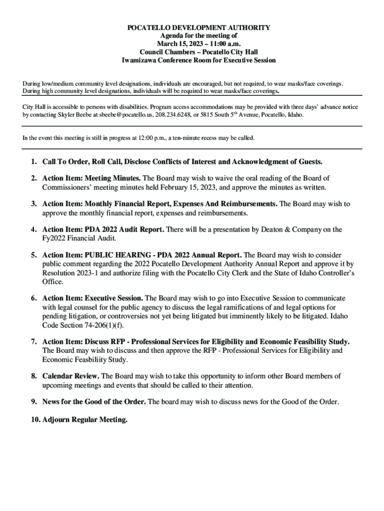 POCATELLO DEVELOPMENT AUTHORITY Agenda for the meeting of March 15, 2023 11:00 a.m. Council Chambers Pocatello City Hall Iwamizawa Conference Room for Executive Session During low/medium community