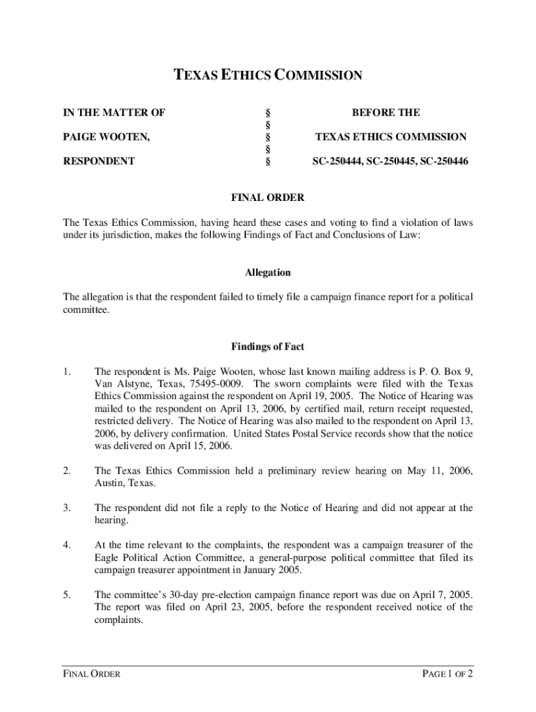 TEXAS ETHICS COMMISSION IN THE MATTER OF PAIGE WOOTEN, RESPONDENT BEFORE THE TEXAS ETHICS COMMISSION SC250444, SC250445, SC250446FINAL ORDER The Texas Ethics Commission, having heard these cases and
