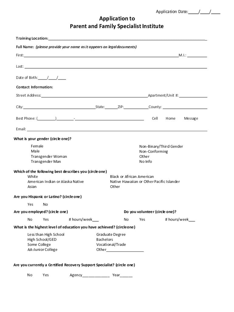 Application Date:Application to Parent and Family Specialist Institute Training Location:First:M.I.:Last: //Contact Information: Street Address:Apartment/Unit #:City:State:Best Phone: ()ZIP:County:CellHomeMessageEmail: