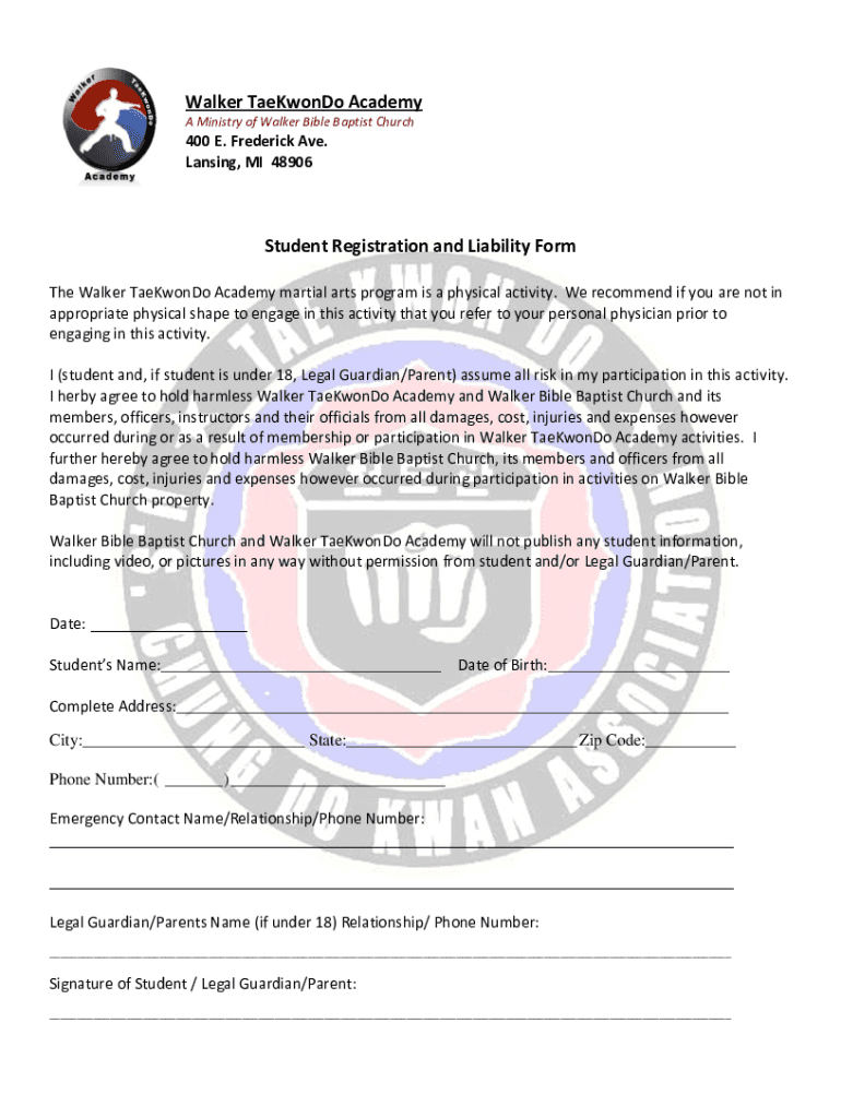 Walker TaeKwonDo Academy A Ministry of Walker Bible Baptist Church400 E. Frederick Ave. Lansing, MI 48906Student Registration and Liability Form The Walker TaeKwonDo Academy martial arts program is