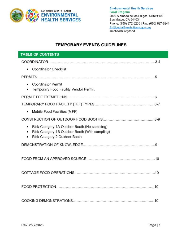Environmental Health Services Food Program 2000 Alameda de leis Pulleys, Suite #100 San Mateo, CA 94403 Phone: (650) 3726200 | Fax: (650) 6278244 EHSpecialEvents@smcgov.org smchealth.org/foodTEMPORARY