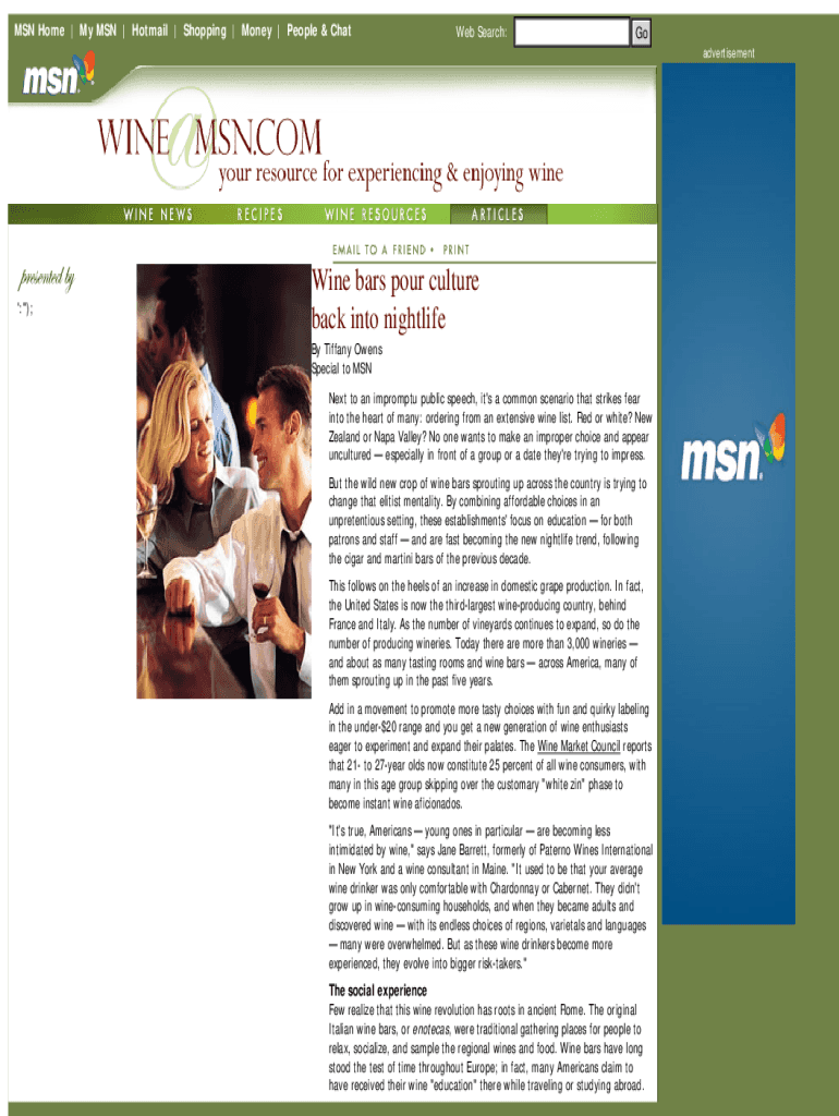 MSN Home | My MSN | Hotmail | Shopping | Money | People & Chat Web Search:Go advertisement\':\'\');Wine bars pour culture back into nightlife By Tiffany Owens Special to MSN Next to an impromptu public