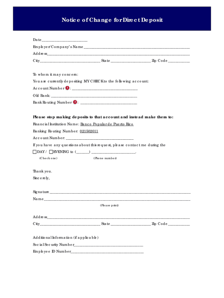 Notice of Change for Direct Deposit Date___ Employer/Companies Name___ Address___ City___ State___ Zip Code___ To whom it may concern: You are currently depositing MY CHECK to the following account: