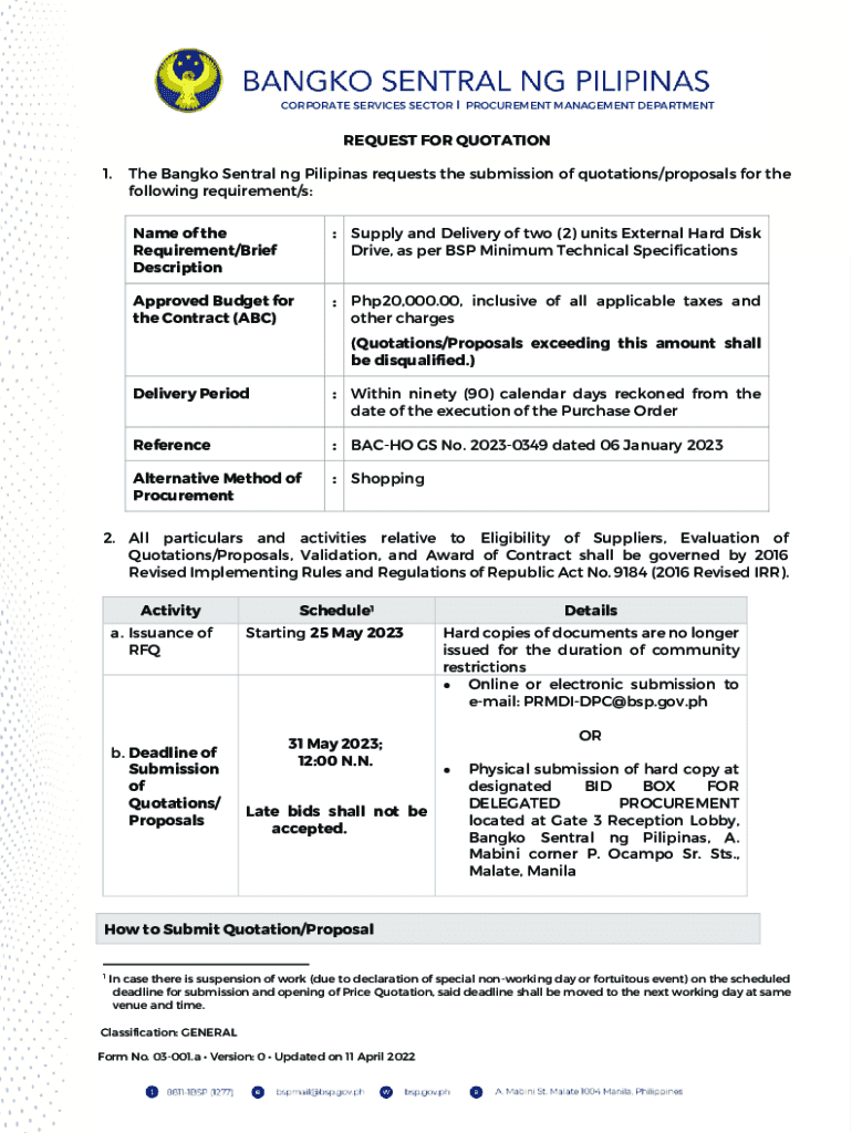 CORPORATE SERVICES SECTOR I PROCUREMENT MANAGEMENT DEPARTMENTREQUEST FOR QUOTATION 1. The Bangkok Central NG Filipinas requests the submission of quotations/proposals for the following requirement/s: