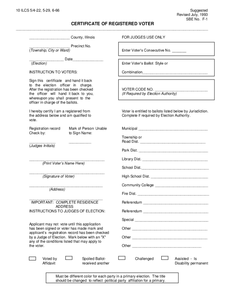 10 ILLS 5/422, 529, 666Suggested Revised July 1993 BE No. F1CERTIFICATE OF REGISTERED VOTER ___ ___ County, Illinois JUDGES USE ONLY___ Precinct No. (Township, City or Ward)Enter Voters Consecutive