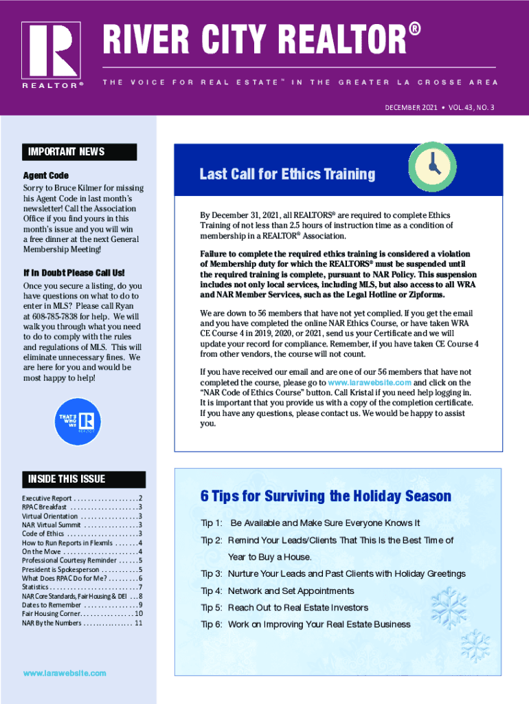 RIVER CITY REALTOR R E A LT O RT H EV O I C EF O RR E A LE S TAT EI NT H EG R E AT E RL AC R O S EA R E DECEMBER 2021 VOL. 43, NO. 3IMPORTANT Newsagent Code Sorry to Bruce Killer for missing his Agent