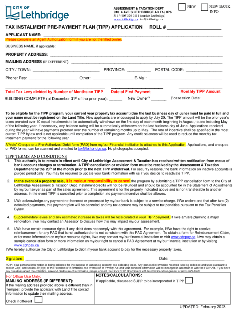 REASSESSMENT & TAXATION DEPT 910 4 AVE S LETHBRIDGE AB T1J 0P6 311 / (403)3203111 (outside Lethbridge) www.lethbridge.ca tax@lethbridge.caTAX Installment PREPAYMENT PLAN (TIPP) APPLICATION BANK INFORMAL