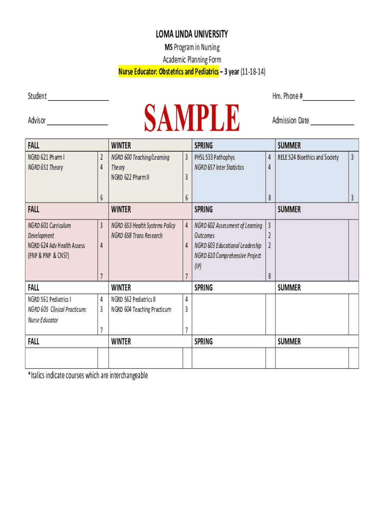 LOMALINDAUNIVERSITY MSPrograminNursing AcademicPlanningForm NurseEducator:ObstetricsandPediatrics3year(111814) Student___ Hm. Phone#___ Advisor___