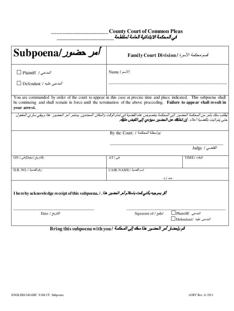 ___ County Court of Common Pleas ___ Subpoena/ Family Court Division / Plaintiff / Name / : Defendant / ___You are commanded by order of the court to appear in this case at precise time and place