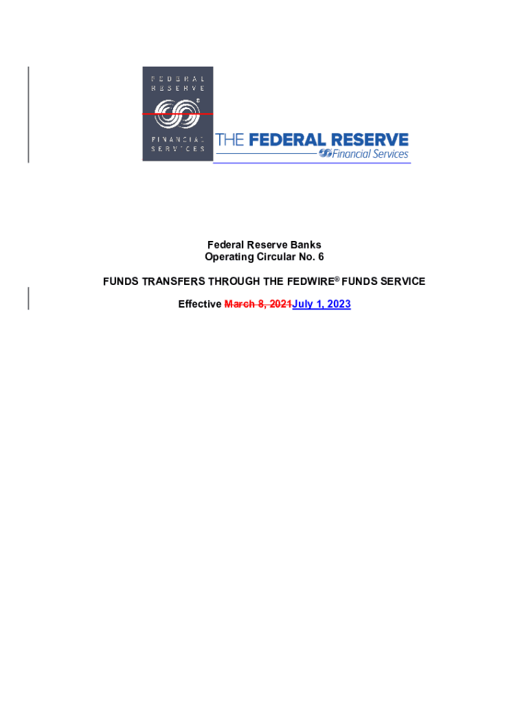 Federal Reserve Banks Operating Circular No. 6 FUNDS TRANSFERS THROUGH THE REWIRE FUNDS SERVICE Effective March 8, 2021July 1, 2023FEDERAL RESERVE BANKS OPERATING CIRCULAR NO. 6 Effective July 1,