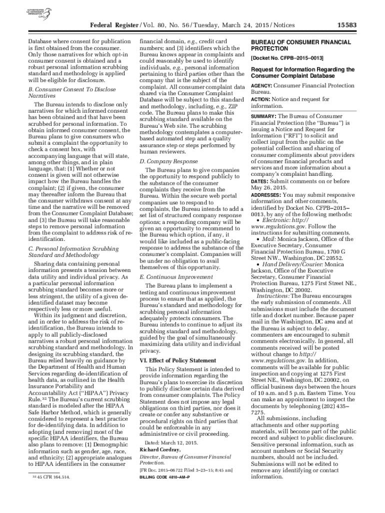 Federal Register / Vol. 80, No. 56 / Tuesday, March 24, 2015 / Notices Database where consent for publication is first obtained from the consumer. Only those narratives for which option consumer consent