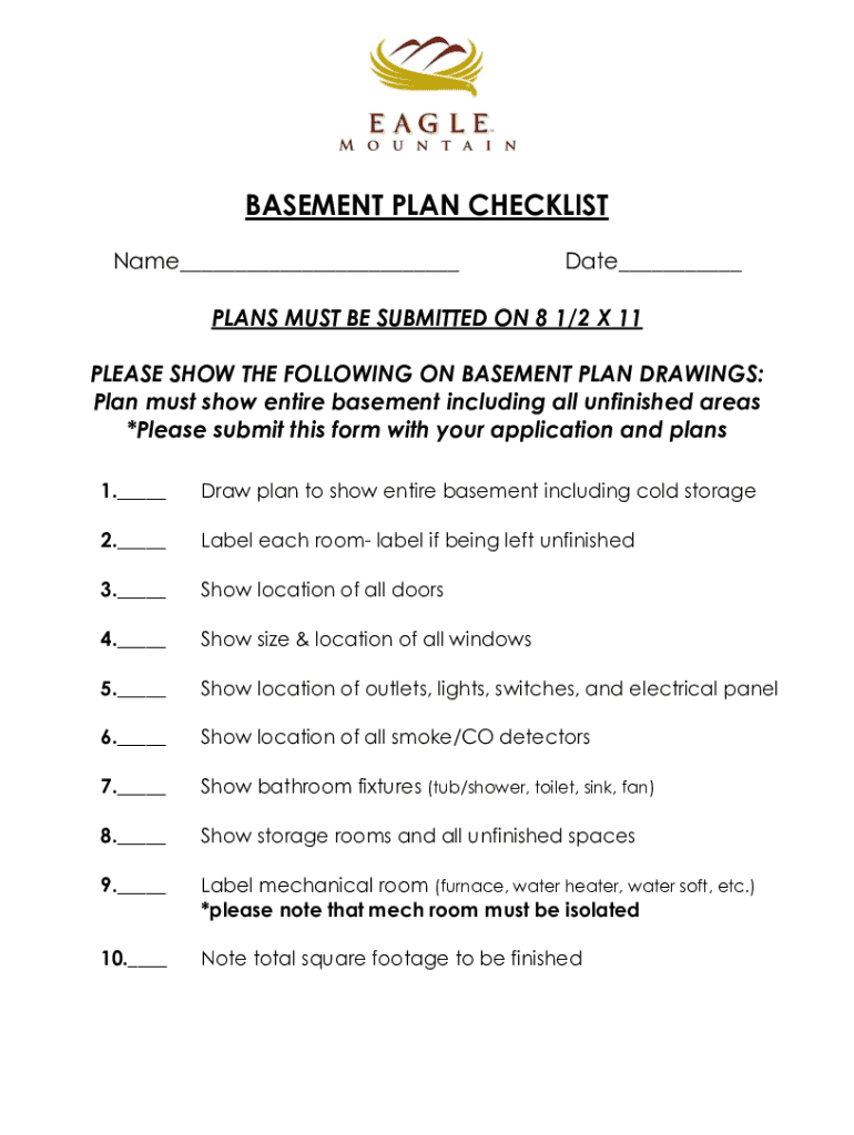 BASEMENT PLAN CHECKLIST Name___Date___PLANS MUST BE SUBMITTED ON 8 1/2 × 11 PLEASE SHOW THE FOLLOWING ON BASEMENT PLAN DRAWINGS: Plan must show entire basement including all unfinished areas *Please