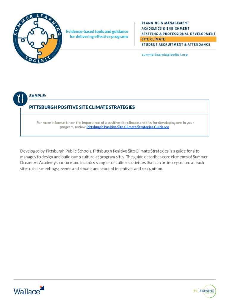 SAMPLE:PITTSBURGH POSITIVE SITE CLIMATE STRATEGIES For more information on the importance of a positive site climate and tips for developing one in your program, review Pittsburgh Positive Site Climate