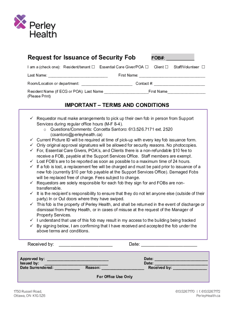 Request for Issuance of Security Fob I am a (check one): Resident/tenant Essential Care Giver/POA Last Name: ___FOB#: ___ Client Staff/Volunteer First Name: ___Room/Location or department: ___ Contact