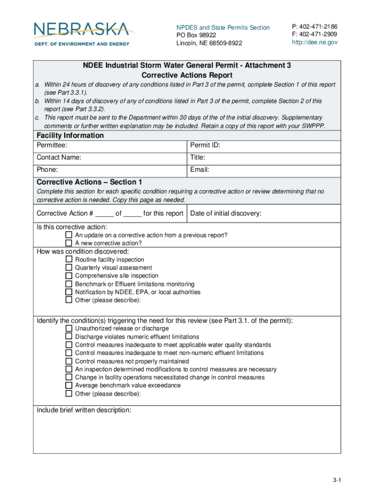 NODES and State Permits Section PO Box 98922 Lincoln, NE 685098922P: 4024712186 F: 4024712909 http://dee.ne.govNDEE Industrial Storm Water General Permit Attachment 3 Corrective Actions Report a.
