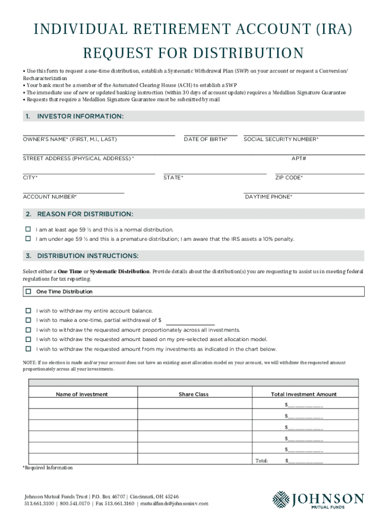INDIVIDUAL RETIREMENT ACCOUNT (IRA) REQUEST FOR DISTRIBUTION Use this form to request a onetime distribution, establish a Systematic Withdrawal Plan (SVP) on your account or request a Conversion/