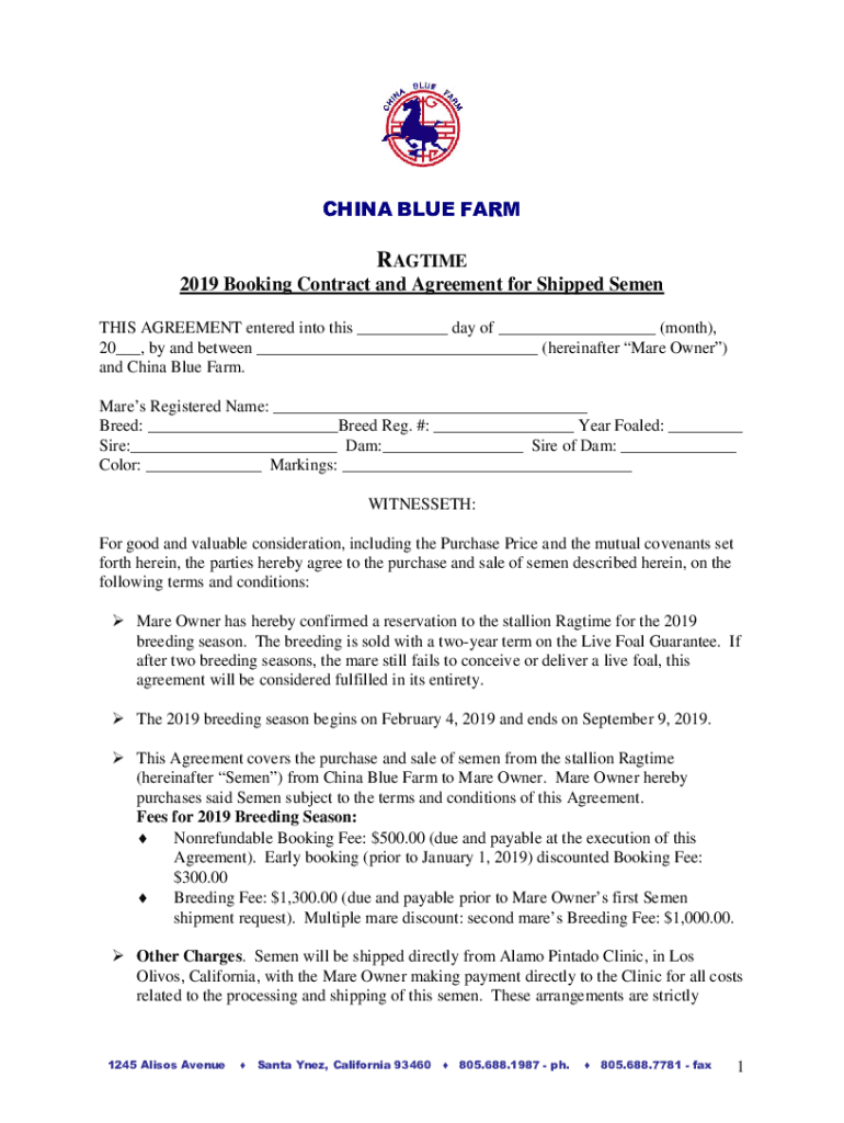 CHINA BLUE FARMRAGTIME 2019 Booking Contract and Agreement for Shipped Semen THIS AGREEMENT entered into this ___ day of ___ (month), 20___, by and between ___ (hereinafter Mare Owner) and China Blue