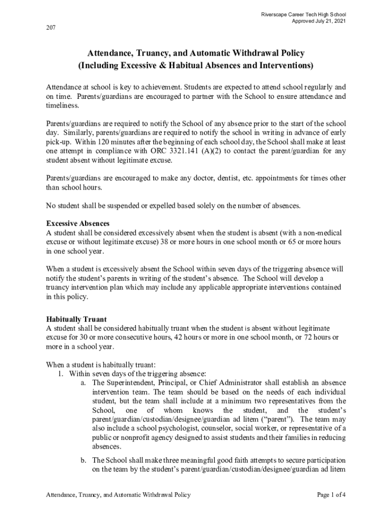 Rivers cape Career Tech High School Approved July 21, 2021207Attendance, Truancy, and Automatic Withdrawal Policy (Including Excessive & Habitual Absences and Interventions) Attendance at school is