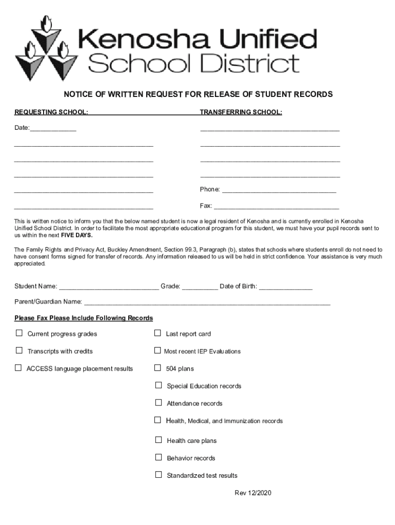 NOTICE OF WRITTEN REQUEST FOR RELEASE OF STUDENT RECORDS REQUESTING SCHOOL:TRANSFERRING SCHOOL:Date:___________________________Phone: ______Fax: ___This is written notice to inform you that the below