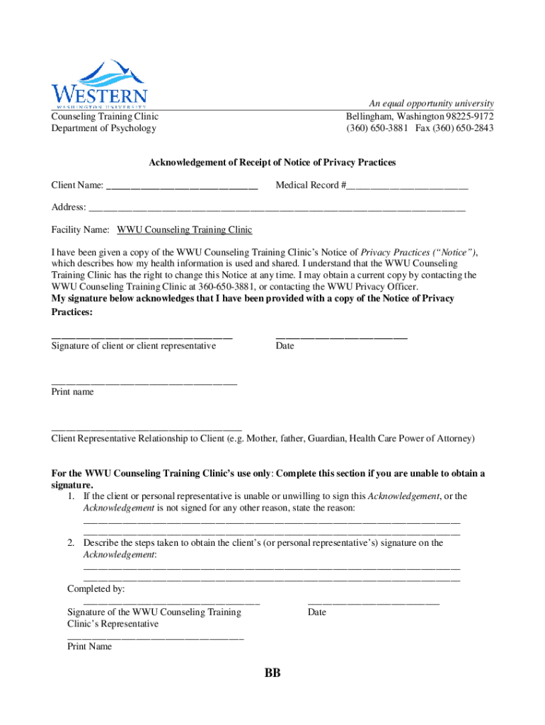 An equal opportunity university Bellingham, Washington 982259172 (360) 6503881 Fax (360) 6502843Counseling Training Clinic Department of PsychologyAcknowledgement of Receipt of Notice of Privacy Practices