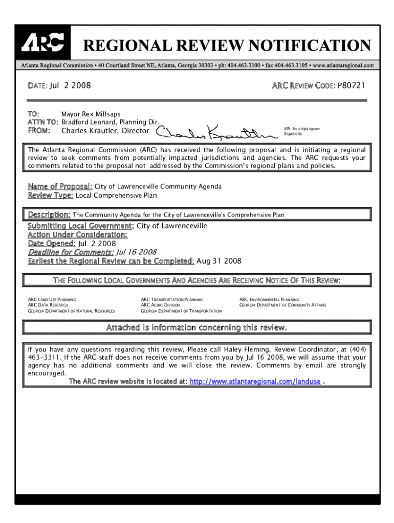 DATE: Jul 2 2008ARC REVIEW CODE: P80721TO: Mayor Rex Mill saps ATTN TO: Bradford Leonard, Planning Dir.FROM:Charles Rattler, Directorate: This is digital signature. Original on file. The Atlanta Regional