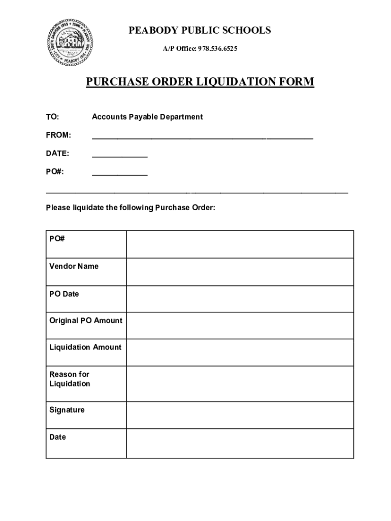 PEABODY PUBLIC SCHOOLS A/P Office: 978.536.6525PURCHASE ORDER LIQUIDATION FORM TO:Accounts Payable DepartmentFROM:___DATE:___PO#:______ Please liquidate the following Purchase Order:PO# Vendor Name