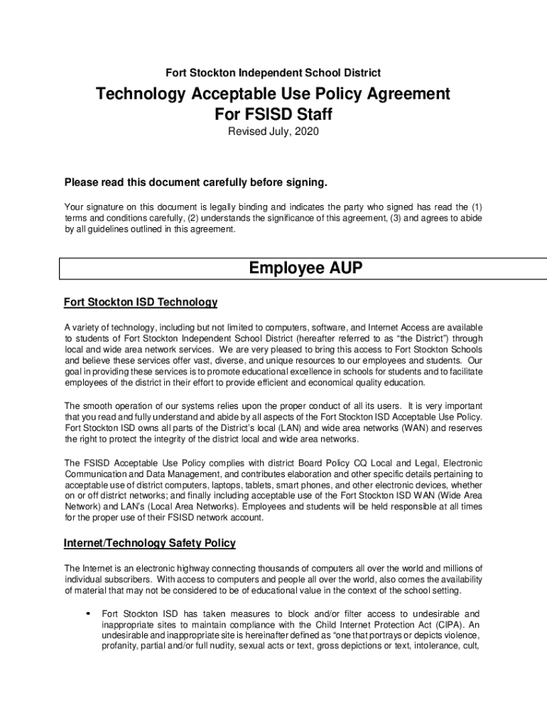 Fort Stockton Independent School DistrictTechnology Acceptable Use Policy Agreement For FS ISD Staff Revised July, 2020Please read this document carefully before signing. Your signature on this document