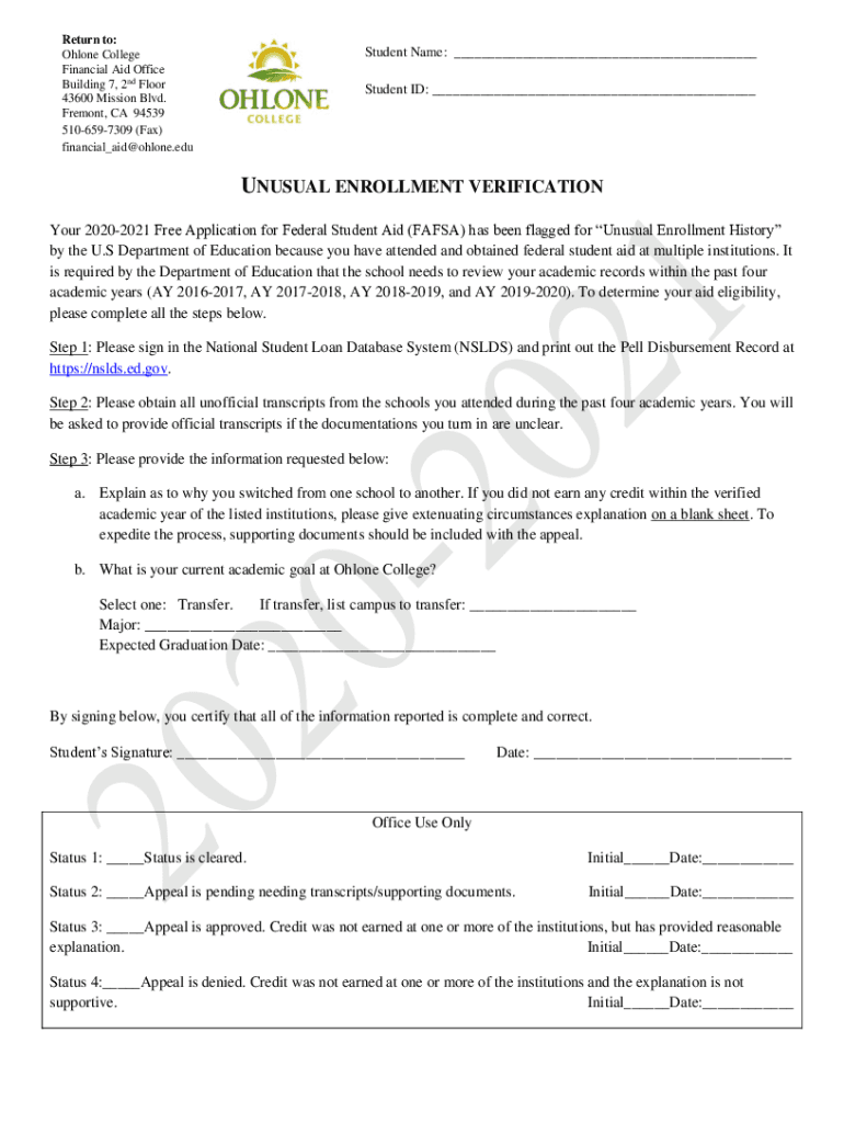 Return to: Oh lone College Financial Aid Office Building 7, 2nd Floor 43600 Mission Blvd. Fremont, CA 94539 5106597309 (Fax) financial_aid@ohlone.eduStudent Name: ___ Student ID: ___UNUSUAL ENROLLMENT