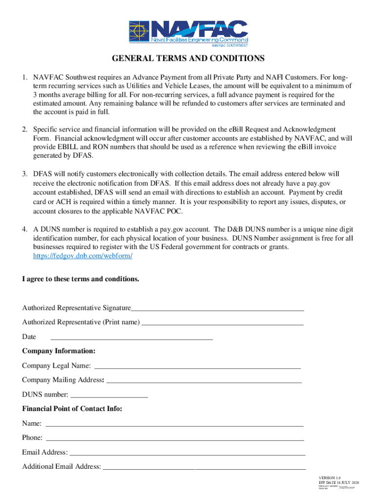 GENERAL TERMS AND CONDITIONS 1. NAVAL Southwest requires an Advance Payment from all Private Party and NAZI Customers. For long term recurring services such as Utilities and Vehicle Leases, the amount