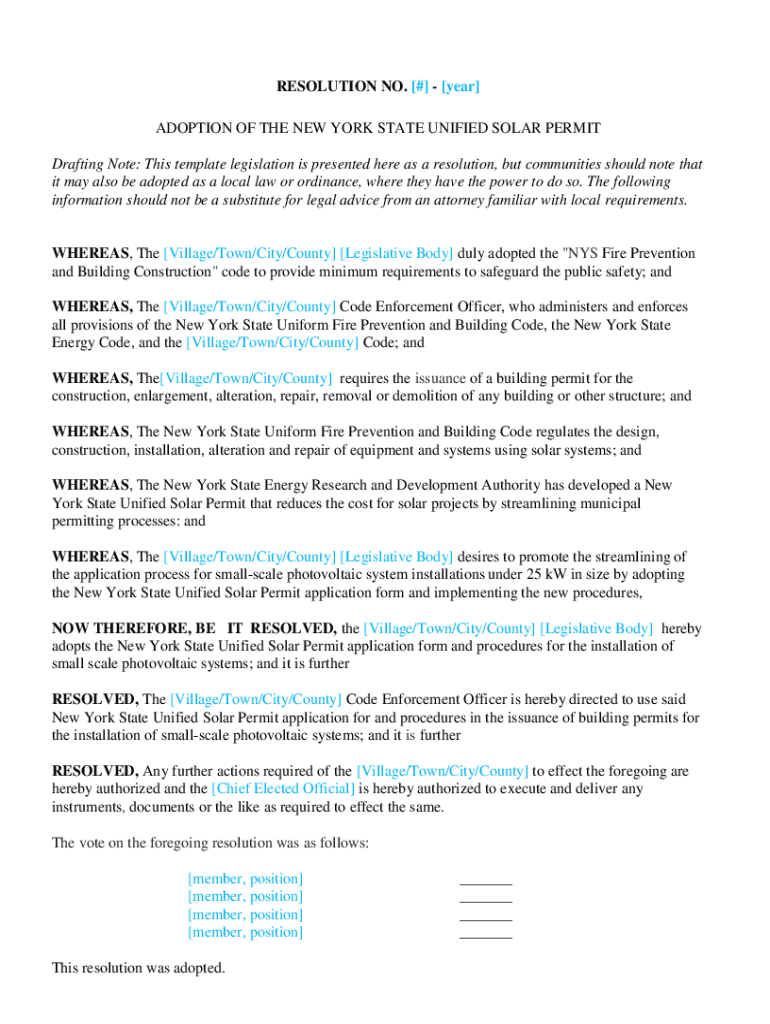 RESOLUTION NO. [#] [year] ADOPTION OF THE NEW YORK STATE UNIFIED SOLAR PERMIT Drafting Note: This template legislation is presented here as a resolution, but communities should note that it may also