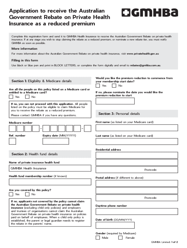 Application to receive the Australian Government Rebate on Private Health Insurance as a reduced premium Complete this registration form and send it to GM HBA Health Insurance to receive the Australian