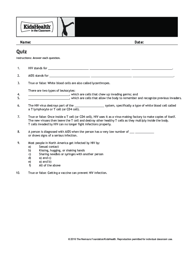Instructions: Answer each question.1.HIV stands for ___ ___ ___.2.AIDS stands for ___ ___ ___.3. True or false: White blood cells are also called misanthropes.4.