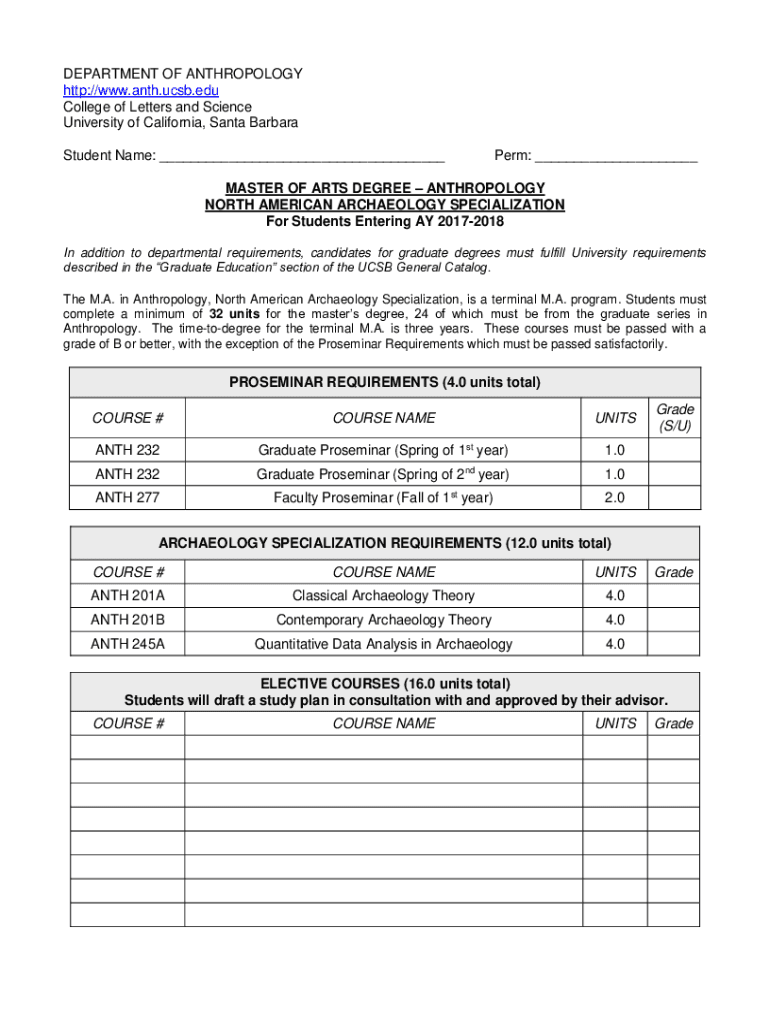 DEPARTMENT OF ANTHROPOLOGY http://www.anth.ucsb.edu College of Letters and Science University of California, Santa Barbara Student Name: ___Perm: ___MASTER OF ARTS DEGREE ANTHROPOLOGY NORTH AMERICAN