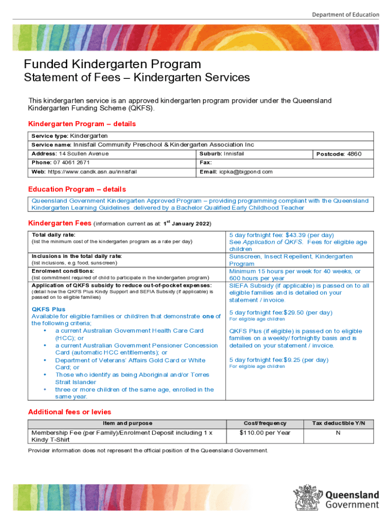 Get the free 2022 Funded Kindergarten Program Statement of Fees 2022.docx
