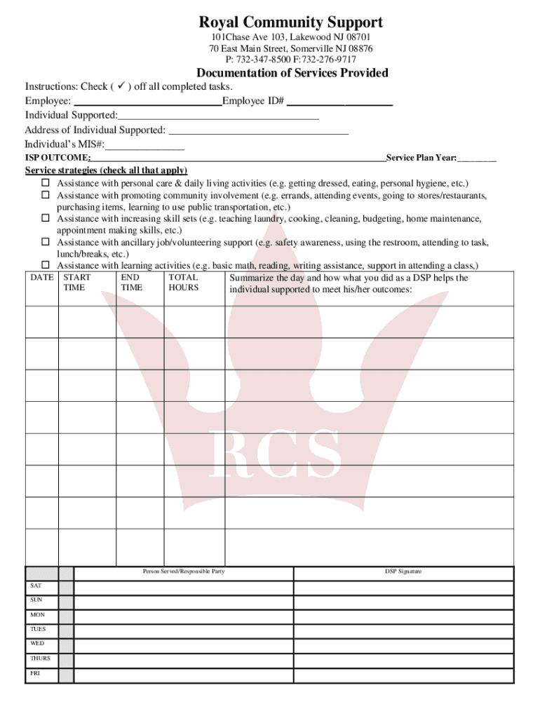 Royal Community Support 101Chase Ave 103, Lakewood NJ 08701 70 East Main Street, Somerville NJ 08876 P: 7323478500 F:7322769717Documentation of Services Provided Instructions: Check () off all completed