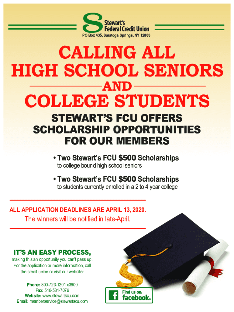 Stewart's Federal Credit Union PO Box 435, Saratoga Springs, NY 12866CALLING ALL HIGH SCHOOL SENIORS COLLEGE STUDENTS STEWART FCU OFFERS SCHOLARSHIP OPPORTUNITIES FOR OUR MEMBERS Two Stewart's FCU