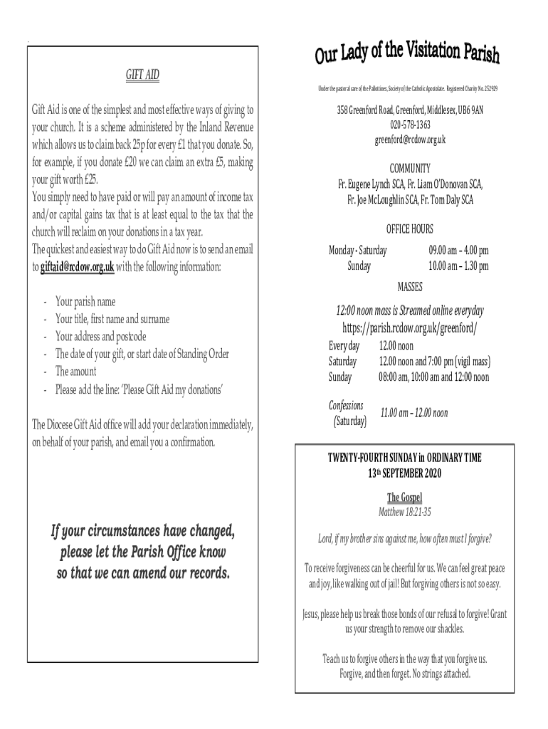 .GIFT AID Under the pastoral care of the Allotting, Society of the Catholic Postulate. Registered Charity No. 252929Gift Aid is one of the simplest and most effective ways of giving to your church.