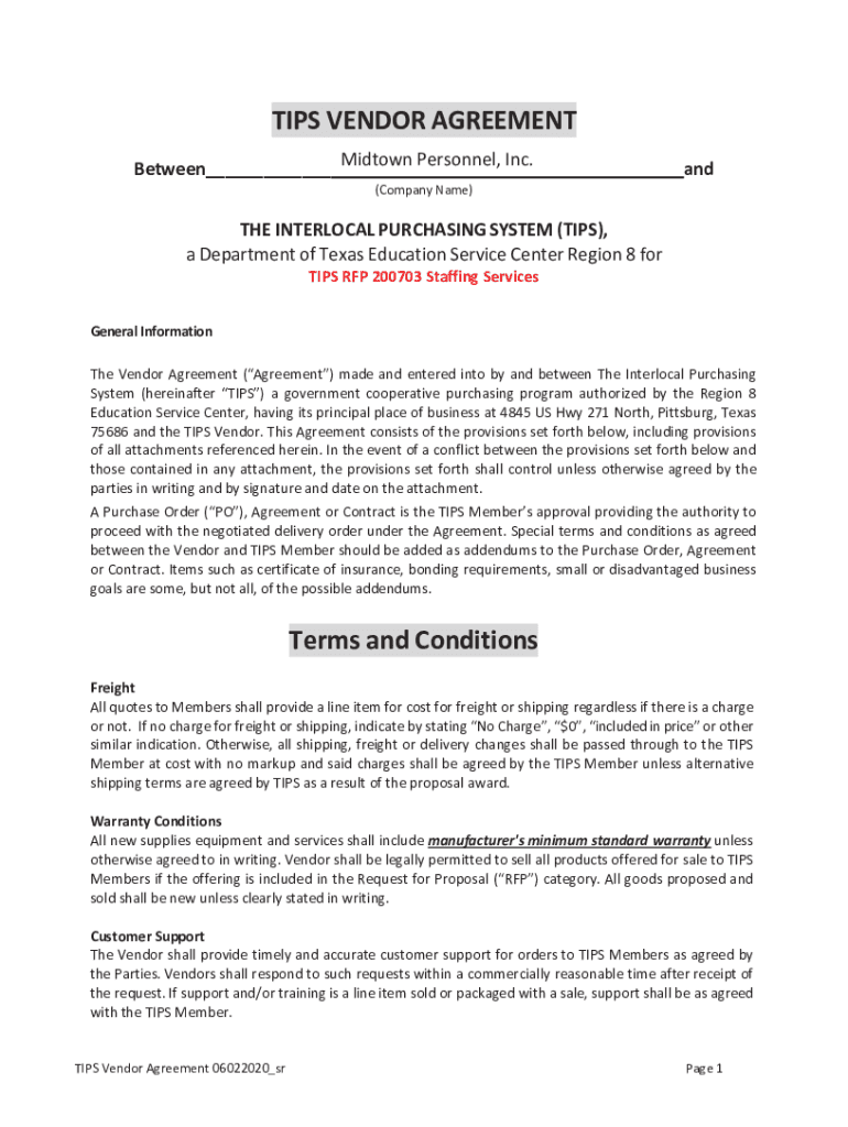 TIPS VENDOR AGREEMENT Between___ DW/and(Company Name)THE INTERLOCK PURCHASING SYSTEM (TIPS), a Department of Texas Education Service Center Region 8 for TIPS RFP 200703 Staffing Services General Information