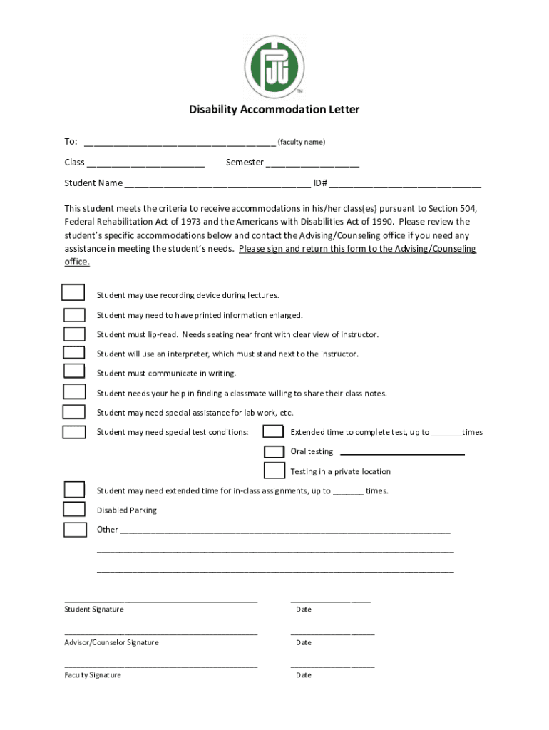 Disability Accommodation Letter To: ___ (faculty name) Class ___Semester ___Student Name ___ ID# ___ This student meets the criteria to receive accommodations in his/her class(BS) pursuant to Section