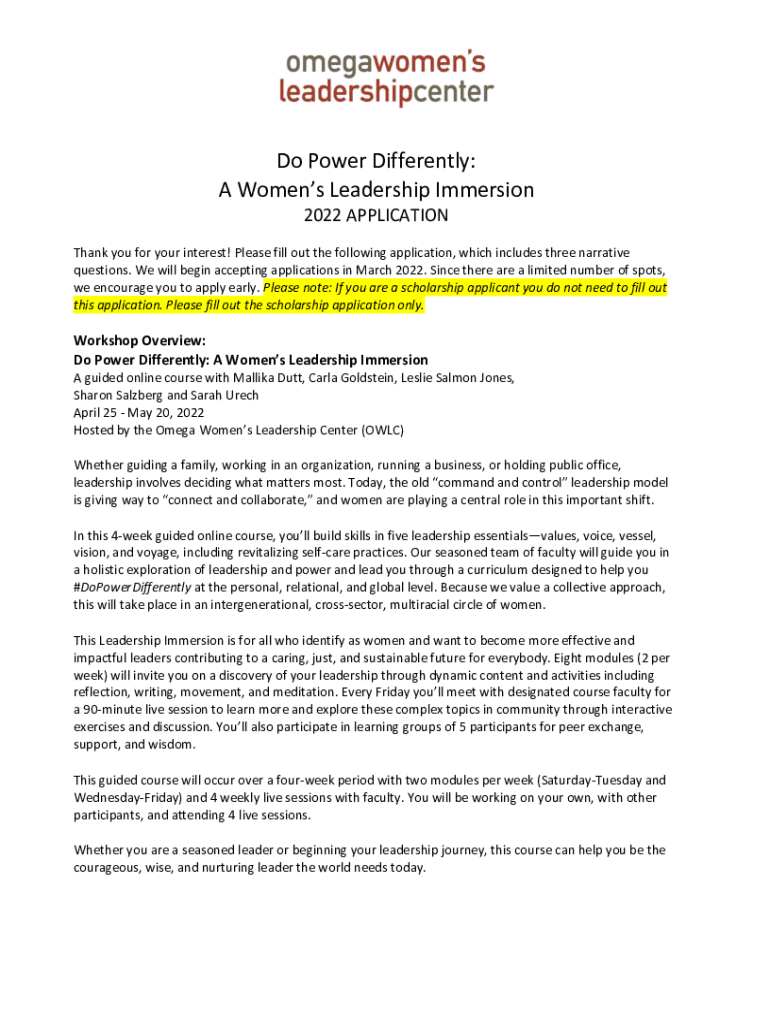 Do Power Differently: A Women's Leadership Immersion 2022 APPLICATION Thank you for your interest! Please fill out the following application, which includes three narrative questions. We will begin