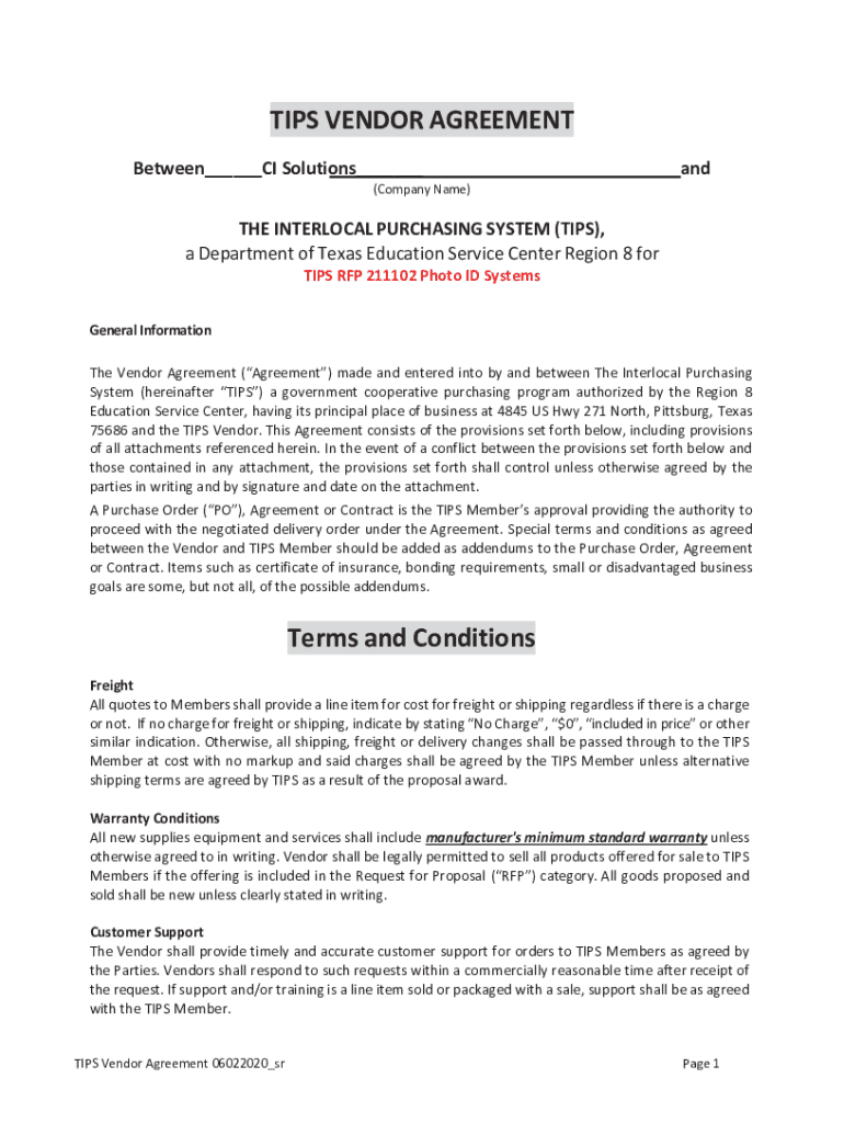 TIPS VENDOR AGREEMENT Between___/^___and(Company Name)THE INTERLOCK PURCHASING SYSTEM (TIPS), a Department of Texas Education Service Center Region 8 for TIPS RFP 211102 Photo ID Systems General Information