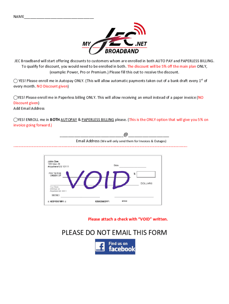 NAME___JEC Broadband will start offering discounts to customers whom are enrolled in both AUTO PAY and PAPERLESS BILLING. To qualify for discount, you would need to be enrolled in both. The discount