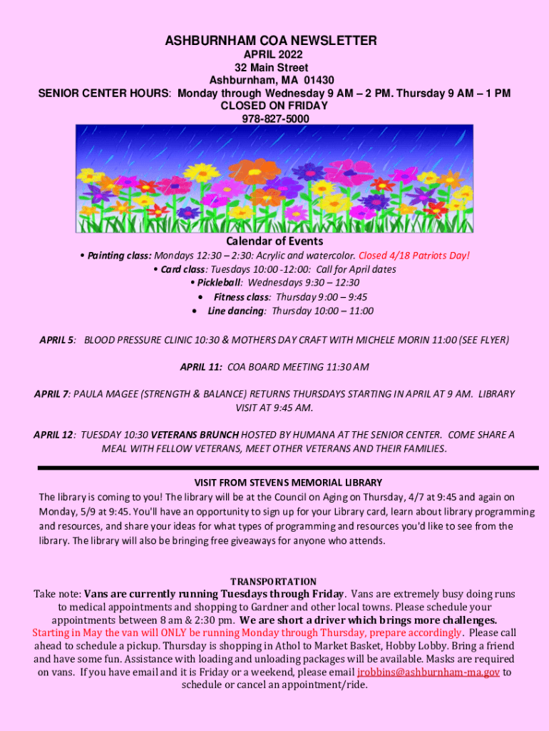 SENIOR CENTER HOURS: Monday through Wednesday 9 AM 2 PM. Thursday 9 AM 1 PM